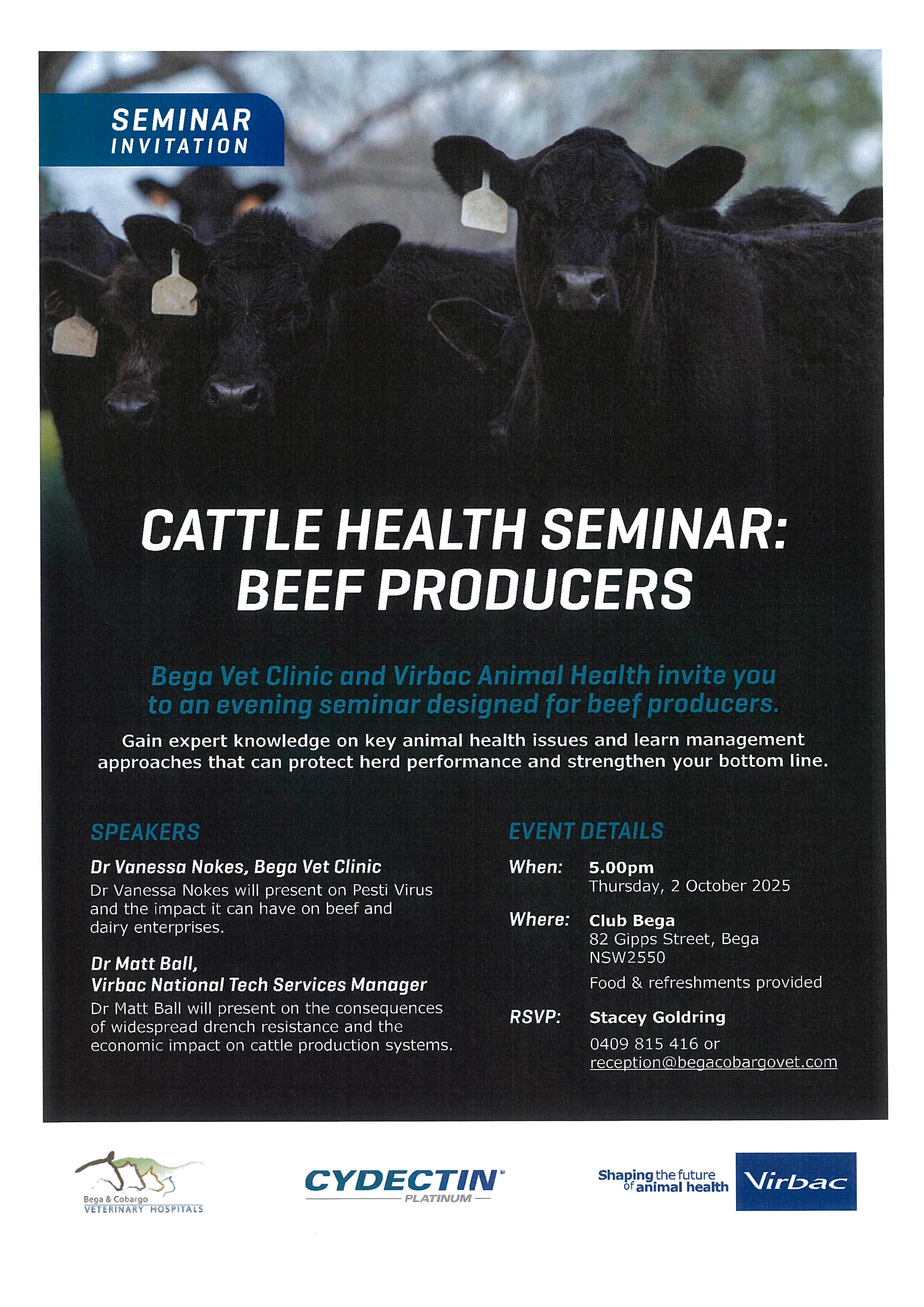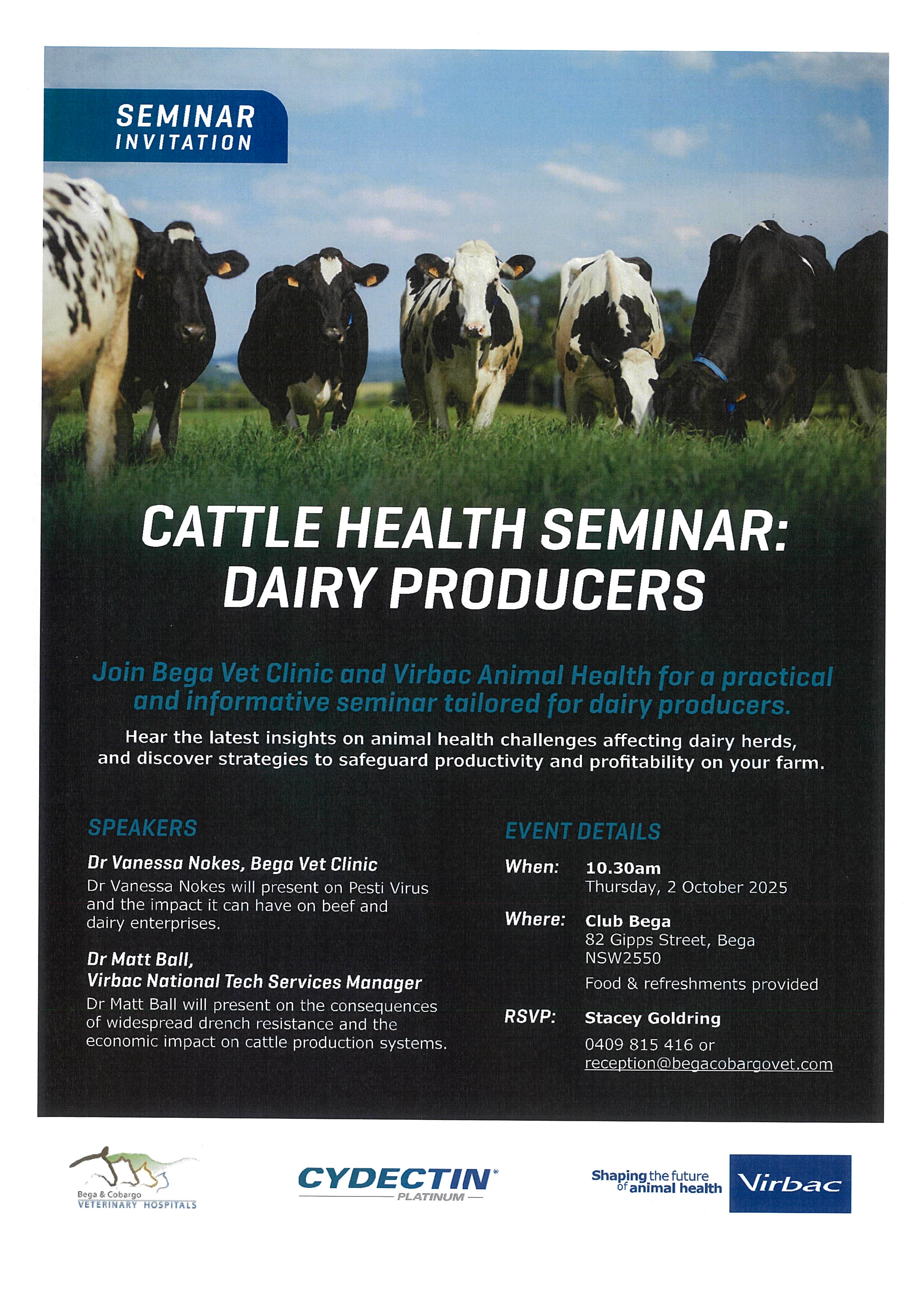 Bega Vet Clinic & Virbac Animal Health invite you to attend either of the below seminars to be held at Club Bega Thursday 2nd October at 10:30am (Dairy Producers) and 5:00pm (Beef Producers) click on link below for more information and RSVP details.